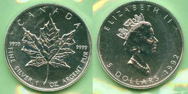 Material: Sterlingsilber 0,999 g fein Gewicht: 31,104 h Durchmesser: 38 mm Nominal: 5 CAD Prägequalität: Stempelglanz Ausgabe: 1992 Auflage: 343.800 Stück